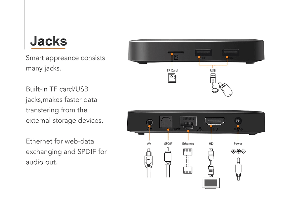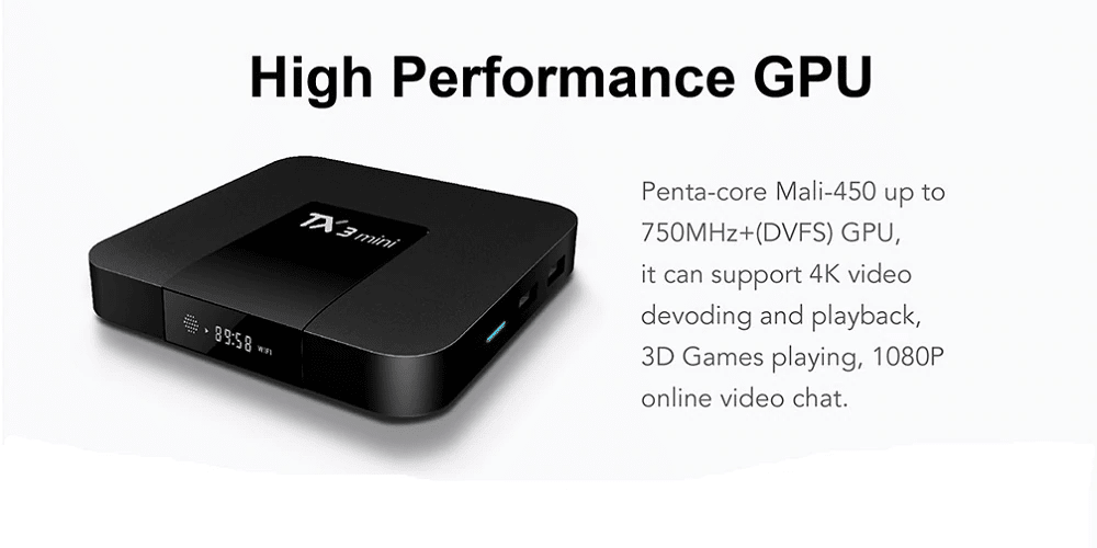 – Équipé d’un processeur quad-core Amlogic S905W, jusqu’à 2 GHz et Mali – GPU 450 penta-core, jusqu’à 750 MHz
