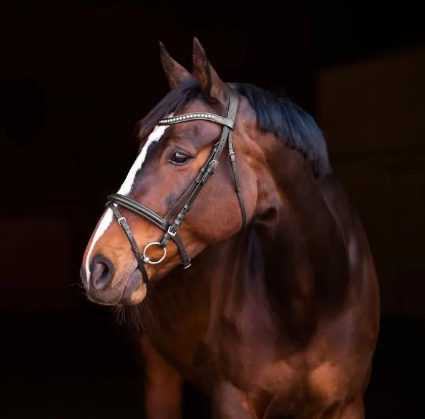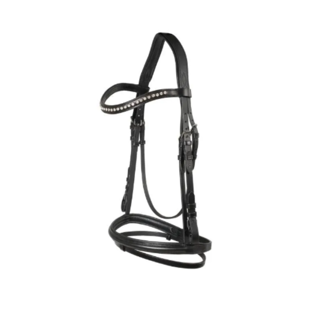 De gros cristaux clairs incorporés dans le frontal bombé rendent ce bridon très attrayant. La têtière de forme ergonomique de ce filet traditionnel favorise un excellent confort au niveau de la tête du cheval. Le cuir souple de ce magnifique bridon est matelassé sur la muserolle pour un meilleur confort. La muserolle combinée peut être enlevée au besoin. Les crochets et la solide bouclerie complètent la finition de ce filet de qualité.