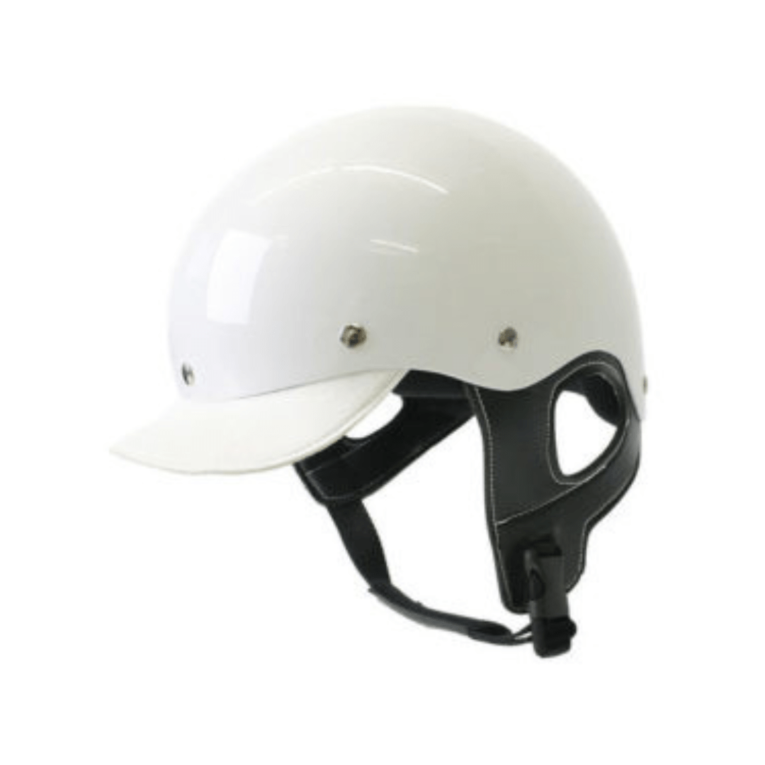 Casque de trot avec visière en cuir et protections au niveau des oreilles. Se fixe sous le menton à l’aide d’un système d’attache rapide.