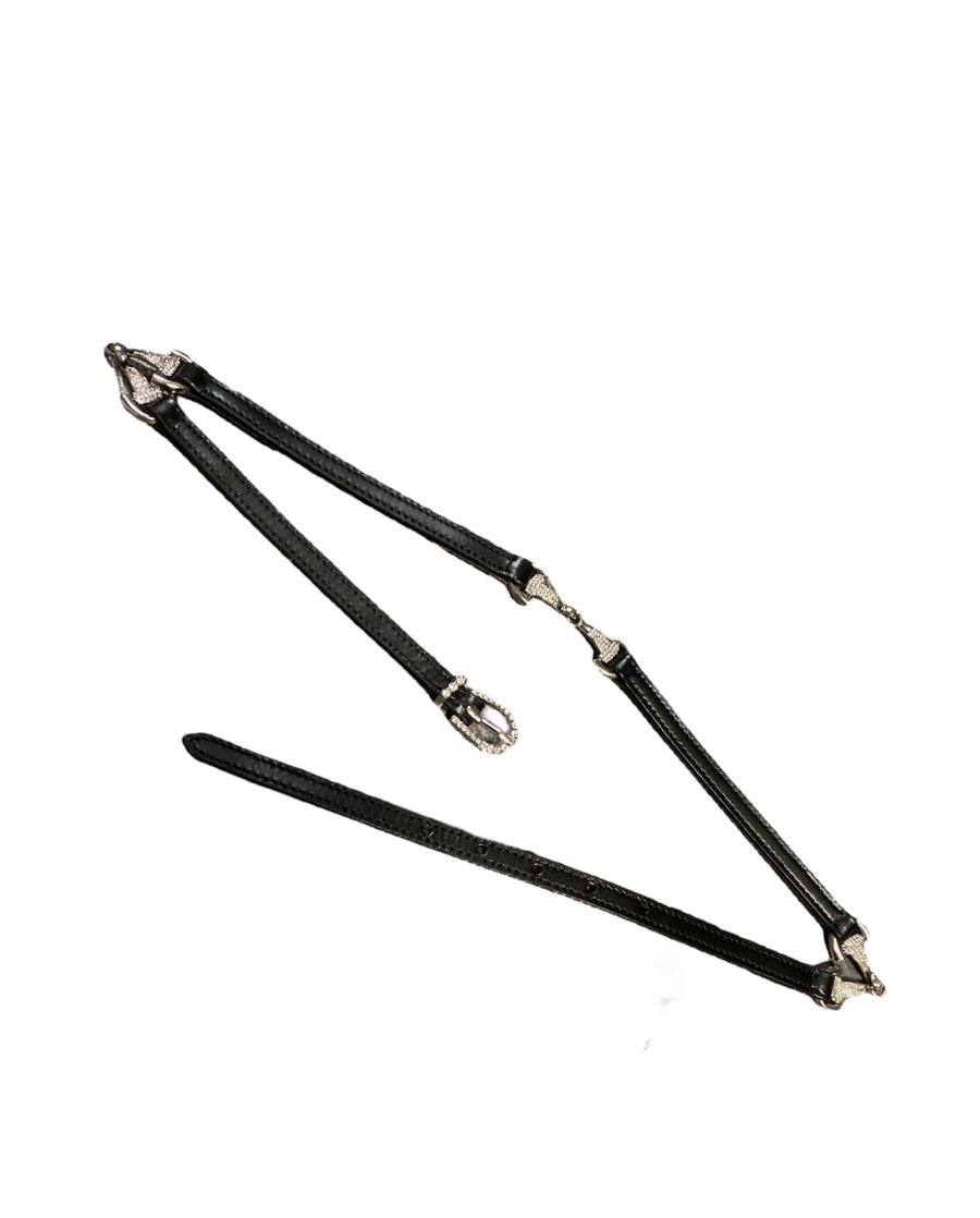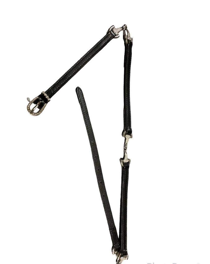 Cette ceinture en cuir possède des mors miniatures a deux endroits ainsi que des cristaux au niveau de la boucle de ceinture.