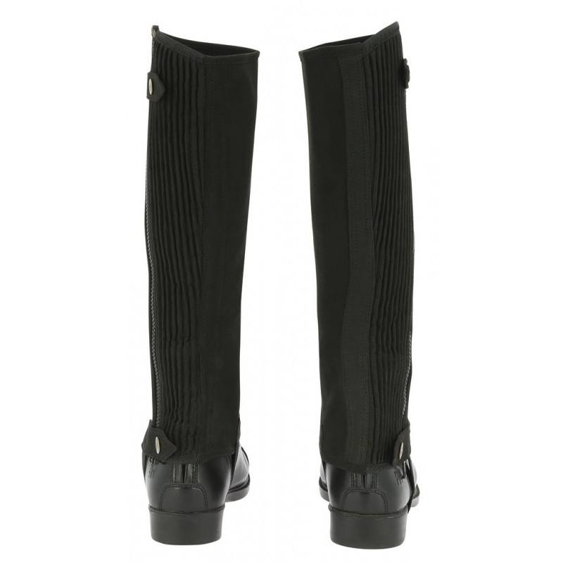 Cou-de-pied et arrière du mollet élastiqués en accordéon et recouvert d’Amara. Fermeture à glissière sécurisée par un bouton pression en haut et en bas. Passage de pied élastique renforcé Amara.