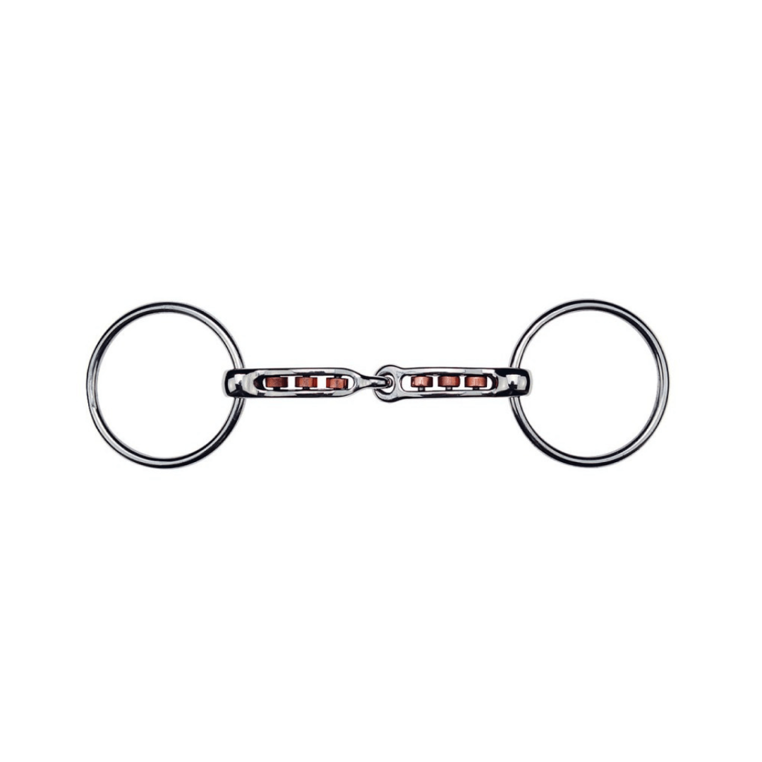 En inox avec rouleaux en cuivre décontractants. Les bords francs des canons incitent les chevaux à ne pas trop s’appuyer. A utiliser avec une main douce.