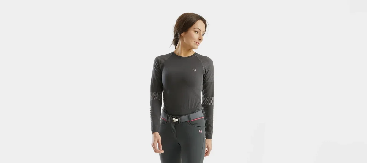 Pour améliorer le maintien du corps de la cavalière à cheval, le T-shirt Optimax dispose d’une technologie de correction posturale.