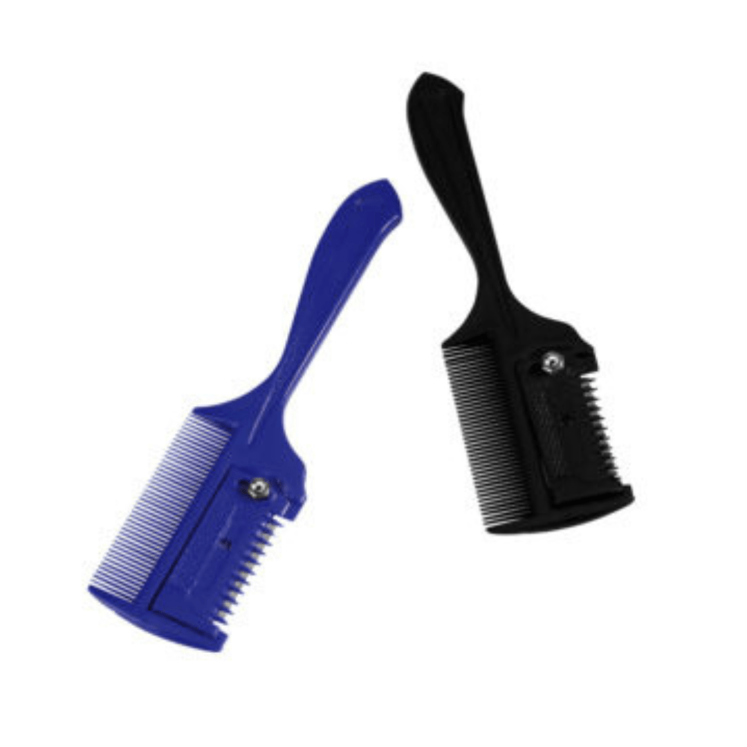 Peigne en plastique équipé d’un côté, d’une rangée de dents pour démêler et de l’autre, d’une lame de rasoir sous cache amovible par vis et dents de protection.