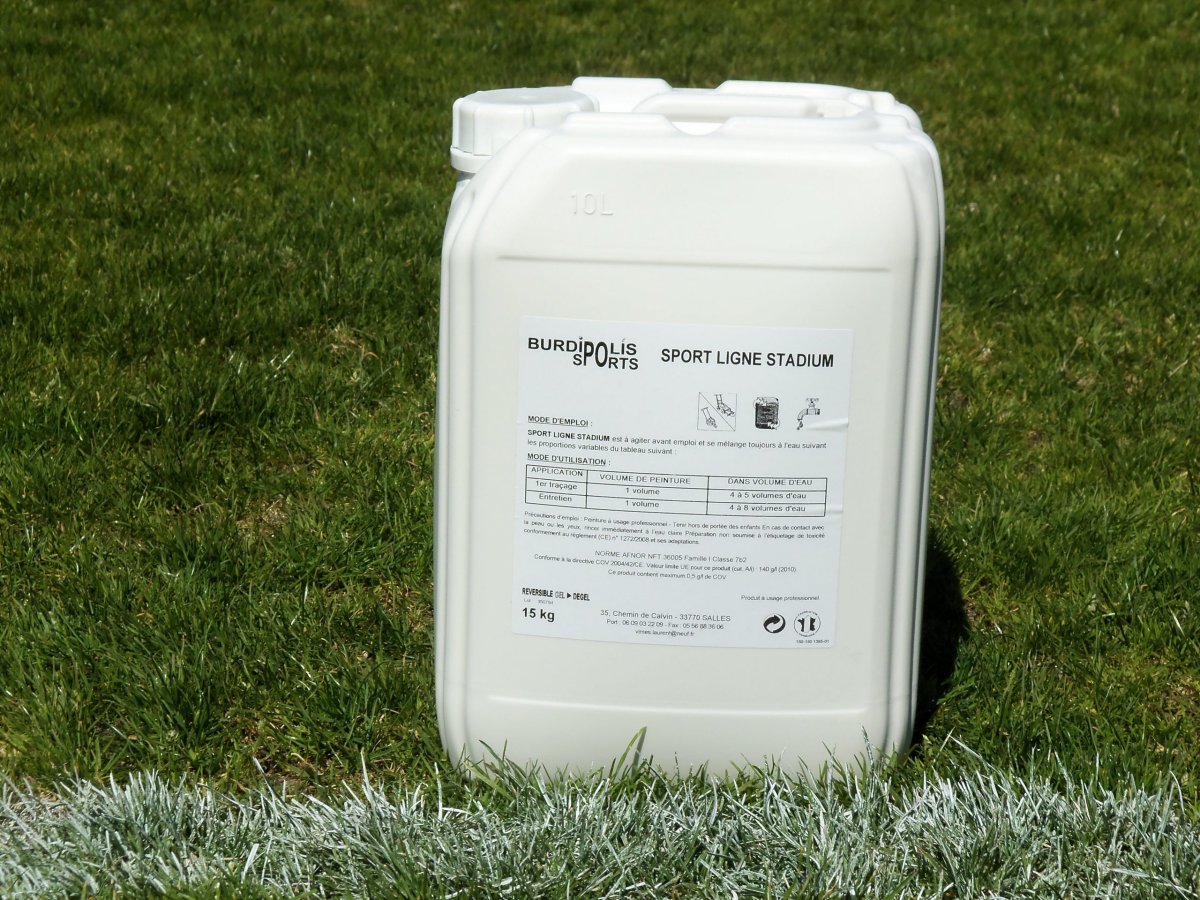 Peinture de traçage blanche concentrée et lumineuse de haute qualité élaborée pour réaliser le traçage des lignes sur les terrains de sport en herbe ou stabilisés.