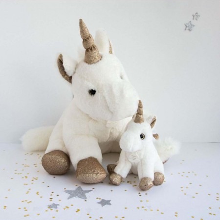 J’aime ma licorne or ! Avec sa belle robe blanche extrêmement douce pour faire des câlins, elle est aussi très girly avec ses yeux brillants à paillettes et ses touches de glitter or. En décoration de chambre ou pour jouer.