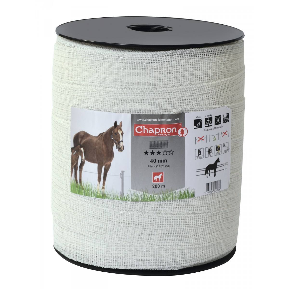 Ruban de clôture électrique pour chevaux 20 mm 5 fils inox 0,20 PE anti-UV Résistance 4,56 Ohms/M Résistance rupture 125 Kg Bobine de 200m et 500m
