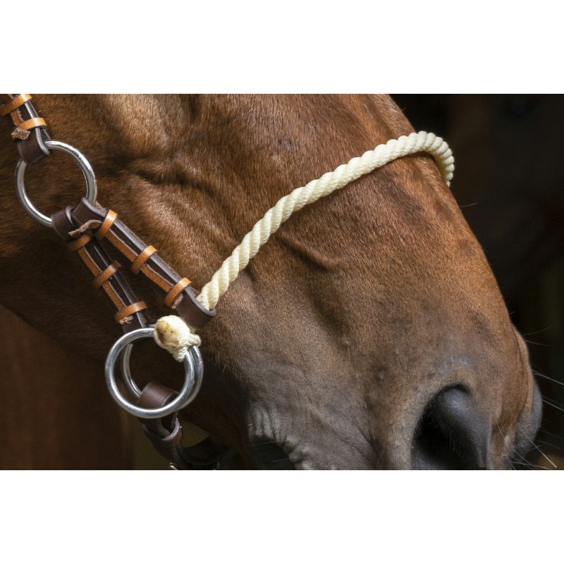 Side-pull en cuir de buffle. Muserolle corde. Coutures blanches. Boucle en inox..