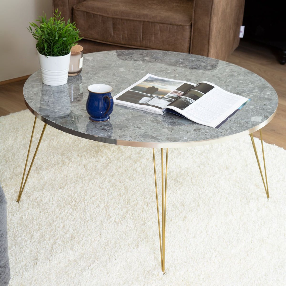 Cette table basse ronde présente des pieds en épingle à cheveux de style moderne avec un dessus de table effet marbre blanc de haute qualité avec de superbes détails dorés riches autour du bord de la table et des pieds en épingle à cheveux dorés. Une excellente façon d’introduire de riches couleurs métalliques dans votre maison. Idéal pour votre salon, chambre, bureau et plus encore.