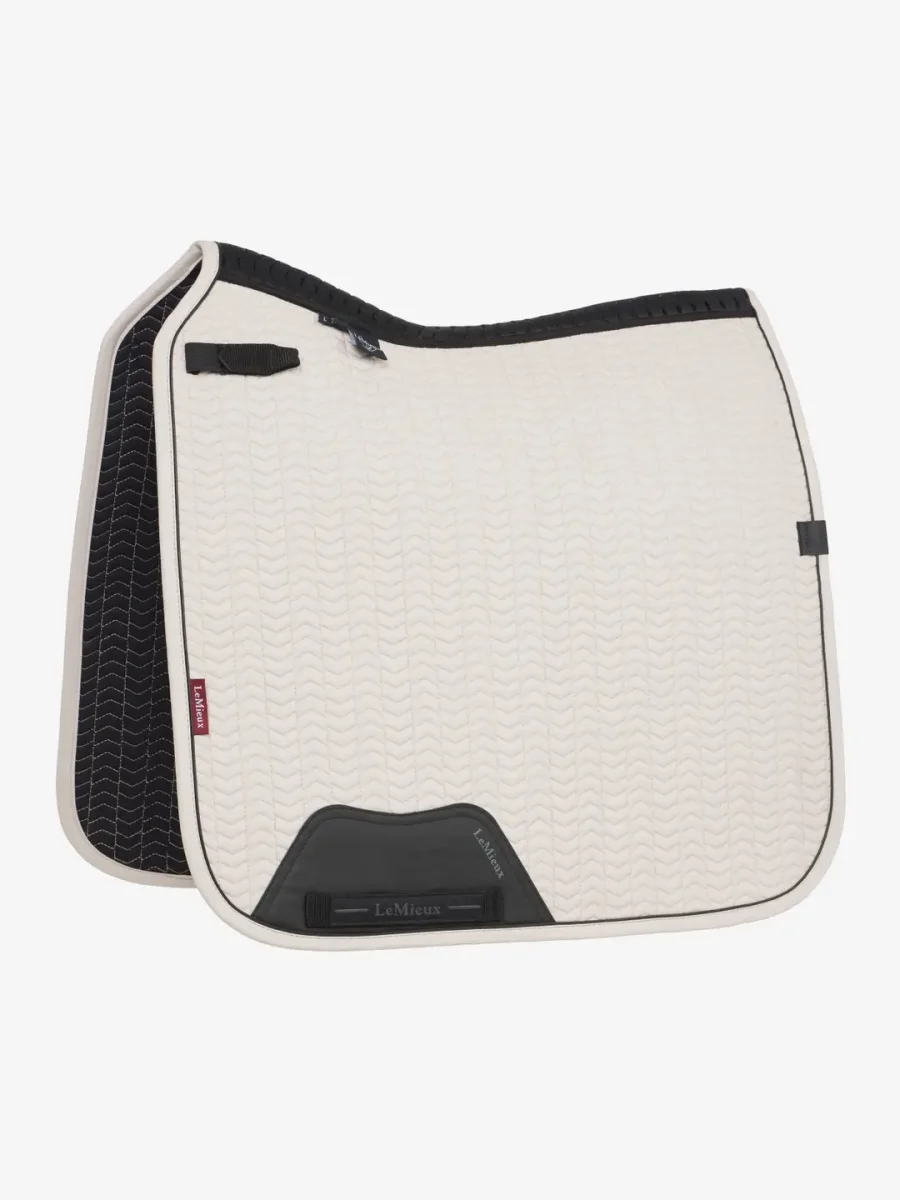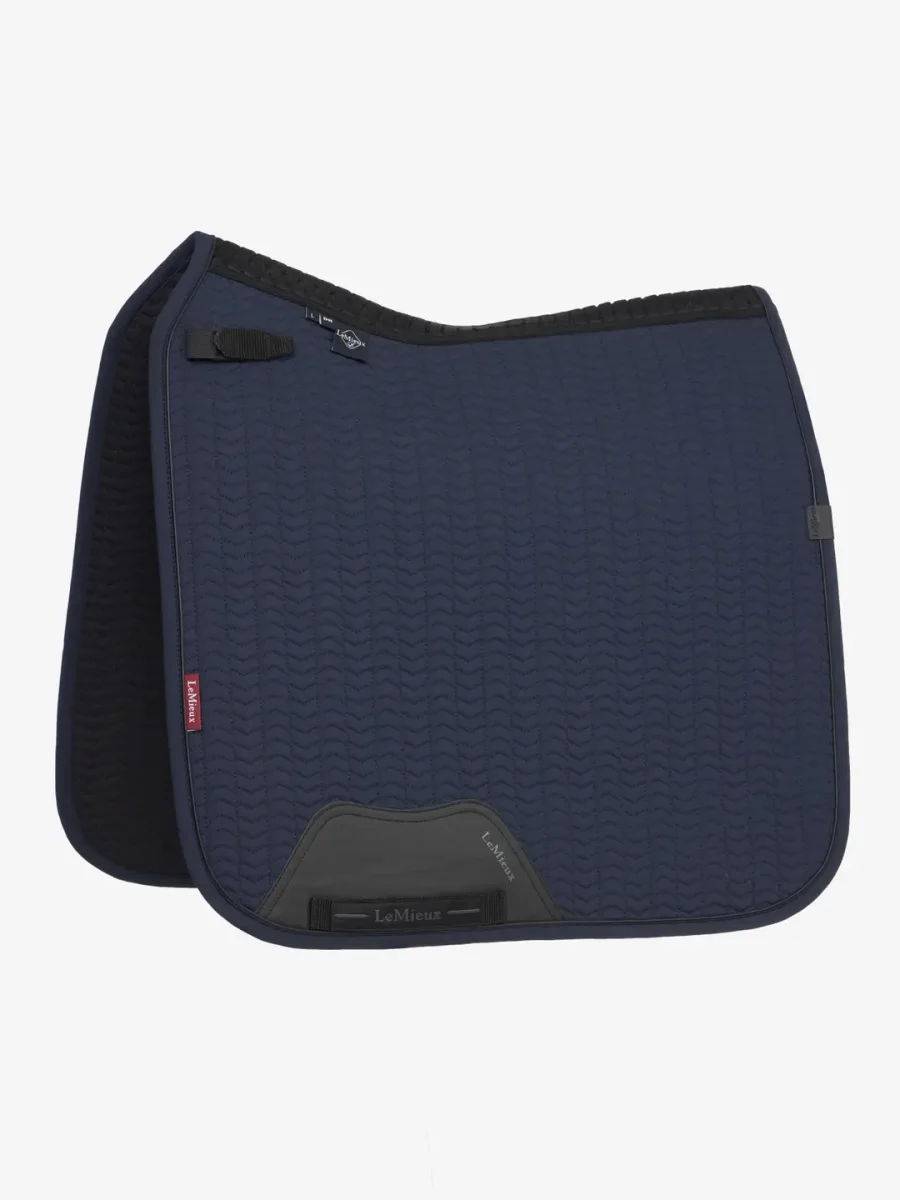 Une étiquette en cuir synthétique estampillée LeMieux apporte une finition luxueuse et élégante, soulignant le raffinement de ce tapis de selle.