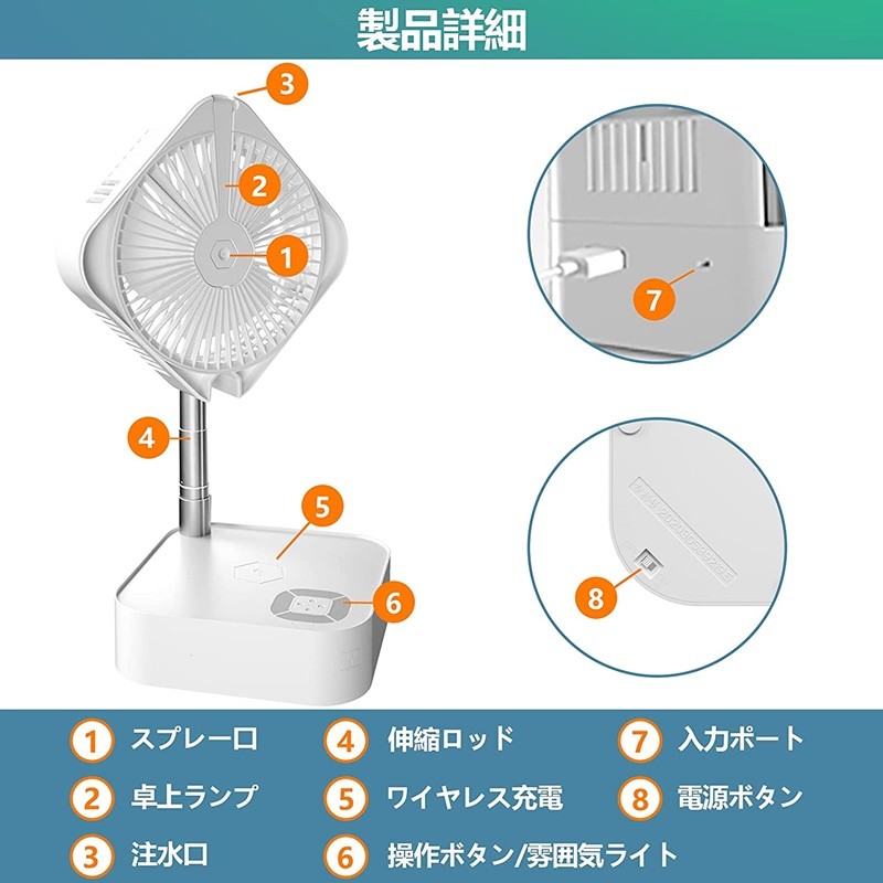 Ventilateur télescopique : la combinaison du ventilateur pliant et pliant le rend plus mignon et à la mode que les ventilateurs ordinaires, ce qui le rend plus pratique à ranger. Ventilateur portable : ce ventilateur est juste la bonne quantité de ventilateur pour les sorties ou la saison de loisirs, et la taille est petite, mais le vent est assez fort pour être utilisé même la nuit. Vitesse du vent réglable : 4 niveaux de débit d’air réglables. Vous pouvez régler la vitesse du vent en fonction de la température de votre choix. Son silencieux et fonctionnement facile avec un seul bouton. Le ventilateur peut être réglé manuellement de haut en bas jusqu’à 135°, ce qui vous permet de refroidir confortablement l’air sous différents angles. Batterie intégrée de 7200 mAh : elle dispose également d’une fonction de charge, vous pouvez donc l’utiliser à la maison ou au travail, la connecter à un ordinateur ou à un autre endroit et elle est livrée avec une batterie de 7 200 mAh qui est très utile même à l’extérieur. Ce produit dispose d’une fonction de charge sans fil qui vous permet de recharger votre téléphone sans fil. Compatible avec tous les appareils de charge sans fil (tels que les smartphones, les écouteurs, etc.) Remarque : 1. Une alimentation externe est nécessaire pour la charge sans fil. 2. Retirez le boîtier lors du chargement sans fil. Pratique à laver : le couvercle du ventilateur est fabriqué en matériau ABS, il est donc respectueux de l’environnement. Lors du nettoyage, aucun outil spécial n’est nécessaire, fixez le cadre d’une main et tirez-le dans le sens antihoraire d’une main. Le capot avant est amovible, ce qui vous permet d’essuyer rapidement et facilement les pales de ventilateur sales. Pratique à utiliser : la télécommande peut être contrôlée à distance. Même à une distance d’environ 9,8 pieds (3 m) et la même opération que le bouton du haut sera commutée en douceur, sans délai. FONCTION HUMIDIFICATION : La fonction brume empêche votre peau de se dessécher, tout en procurant un effet relaxant avec votre arôme préféré. Remarque : L’humidificateur a une capacité de 120 ML. La brume est intermittente. Après le remplissage d’eau, il y aura une légère fuite d’eau sur la buse. C’est un phénomène normal Veilleuse et liseuse : équipée d’une veilleuse et d’une liseuse. La lampe de lecture peut être réglée sur 3 niveaux de luminosité. Le ventilateur et la lampe de lecture peuvent être utilisés en même temps, ce qui facilite le travail ou l’étude en été. Si vous l’utilisez comme veilleuse, elle apaisera les couleurs douces pour vos yeux. Il n’écrasera pas vos yeux même lorsque vous vous réveillerez la nuit et n’affectera pas le sommeil des personnes âgées et des enfants.