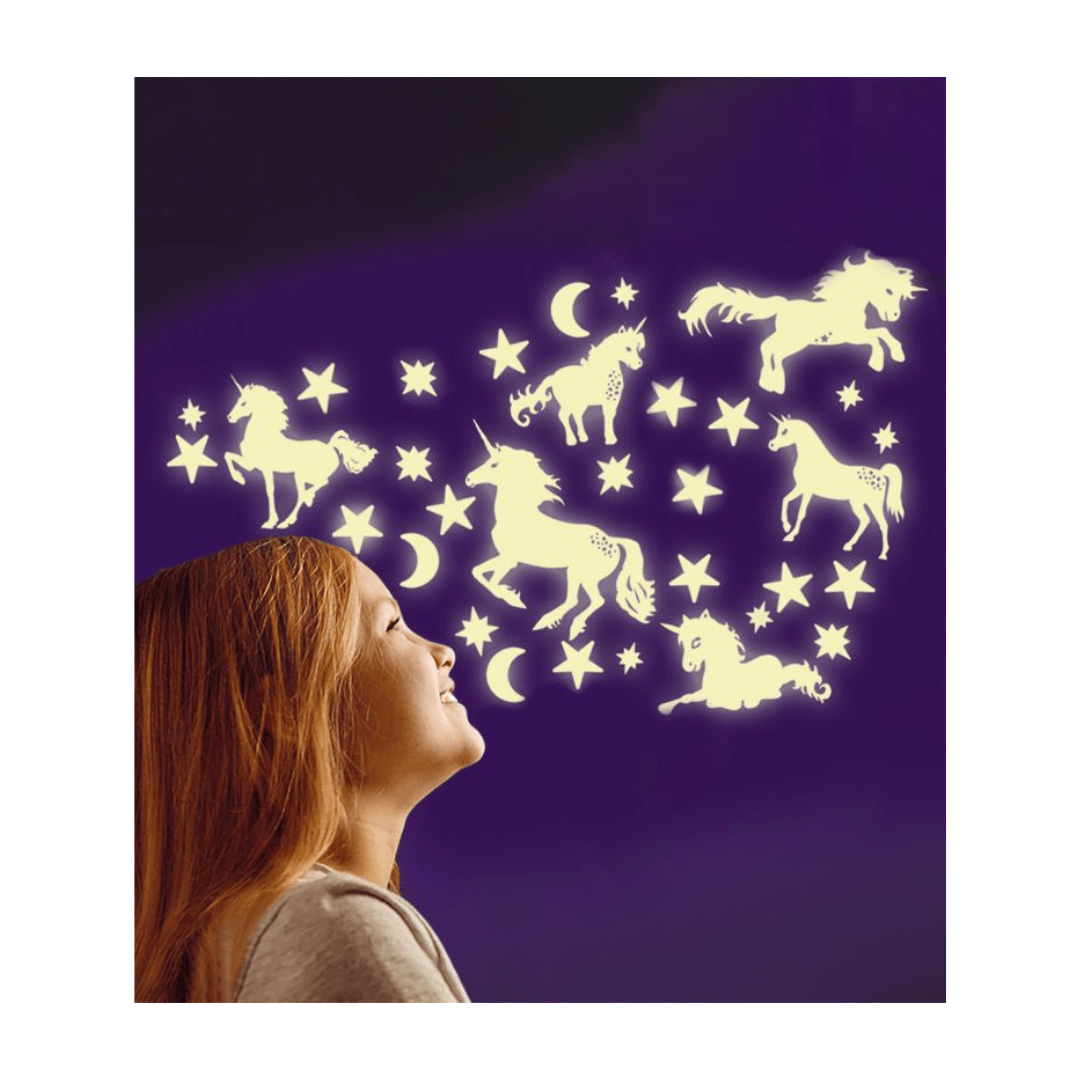 En plastique. Set comprenant six licornes, une lune et de nombreuses étoiles de toutes tailles qui sont fluorescentes dans la nuit. Contient également des pastilles autocollantes pour transformer le plafond et les murs en magnifique ciel nocturne.