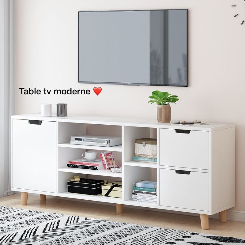 Meuble TV au style scandinave est composée de panneaux de particules. La base de la commode est constituée de pieds en bois. Cette commode moderne pour le salon a été équipée d’une étagère et de 3 armoires, grâce auxquelles nous pouvons facilement accueillir tous les articles et équipements dont nous avons besoin. Une commode modern aura fière allure dans un intérieur scandinave ou moderne. La commode sera un meuble stable et décoratif pour notre téléviseur.