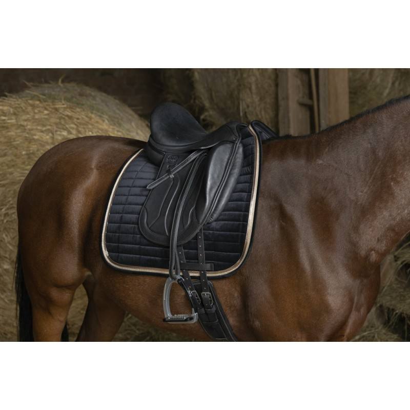 Tapis effet velours en 100 % polyester avec surpiqûres rectangulaires. Matelassé de 10 mm de mousse et de polyfill 250 g/m². Orné d’un double passepoil. Doublure en mesh rendant le tapis très respirant.